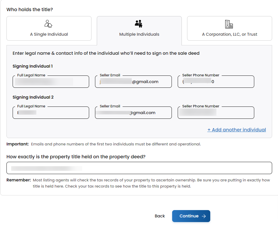 If there are two sellers associated with a listing, then under the Title tab (Step 5 of the Houzeo listing process), all owners must provide their full name, email address, and contact number.