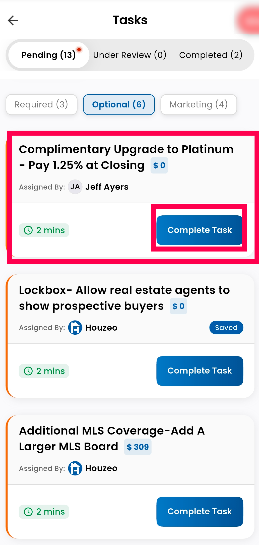 Initiate Upgrade: Click on the upgrade task to proceed with transitioning to the Gold or Platinum Plan. This upgrade typically involves a 1.0% (Gold) or 1.25% (Platinum) closing cost, but waives the upfront fee difference between your current plan and the new plan.