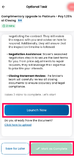 Step 5: Click on the upgrade task to proceed with transitioning to the Gold or Platinum Plan. Click on Launch Now. This upgrade typically involves a 1.0% (Gold) or 1.25% (Platinum) closing cost, but waives the upfront fee difference between your current plan and the new plan.