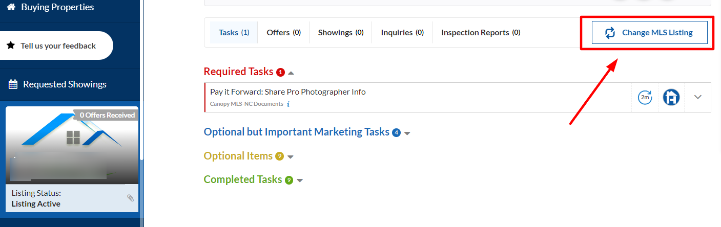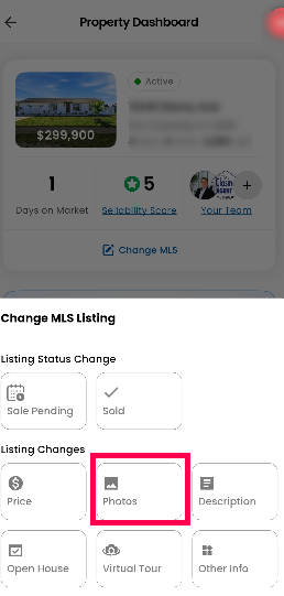 If your listing status is "Listing Docs Pending," please ensure that you complete the required documents assigned to you. Once you have completed the documents, you will gain access to the "Change MLS Listing" option, allowing you to proceed with updating the photos of your property.