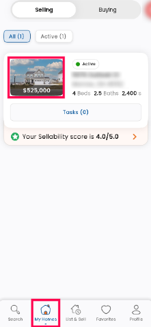Step 1: Log in to your Houzeo Mobile App and click on 'My Homes" and click on your properties' "Primary Image."