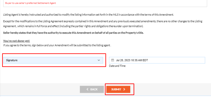 Step 4: To complete the process, please sign the amendment form. Once you have signed the amendment request, click on "Submit". This will create an amendment task that your listing agent will review.