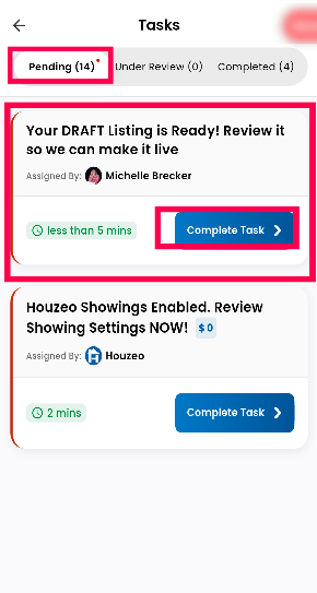 Step 3: Click on the task. Once you do, you will see the option for Pending. Look for the option for "Your DRAFT Listing is Ready! Review it so we can make it live" and then click on Complete Task.