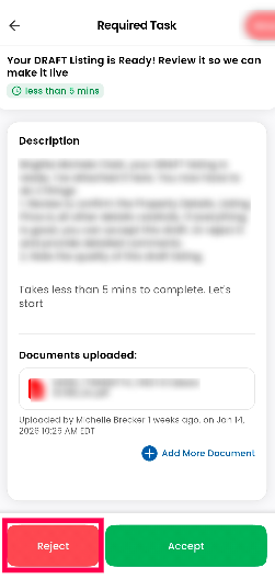 Upon rejection, your listing agent will implement the required modifications in accordance with MLS rules and will assign a new draft listing PDF for your review.